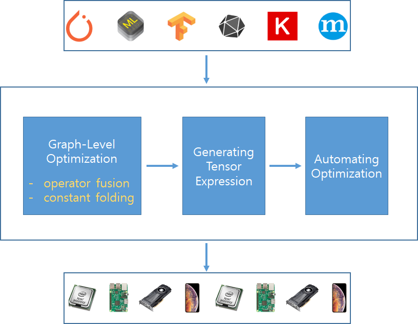 TVM의 핵심은 Pytorch/Tensorflow/ONNX 등등의 서로 다른 DL 프레임워크에서 학습된 모델을 Arm, Intel 등등의 서로 다른 하드웨어 아키텍쳐에 맞게 최적화 및 컴파일하는 것이다.