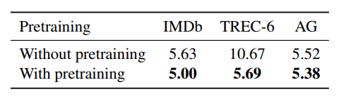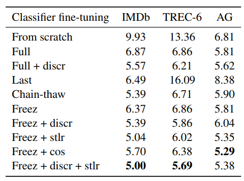 위에서부터 차례대로 IMDb, TREC-6, AG인데 ULMFiT에 해당하는 노란색 선들은 비교적 안정적이고 시간이 지나면 지날수록 error rate도 작아지는 방향으로 간다. (흠, 마지막 AG에 대해서는 조금 애매하긴하다..)